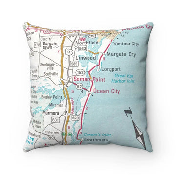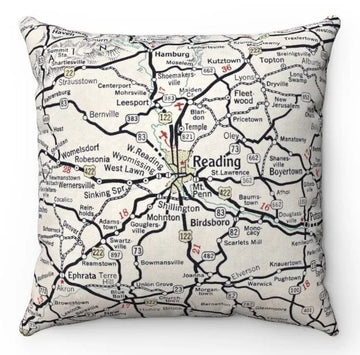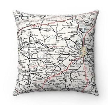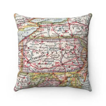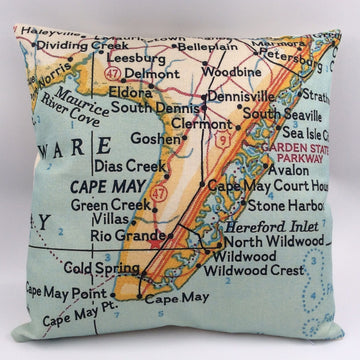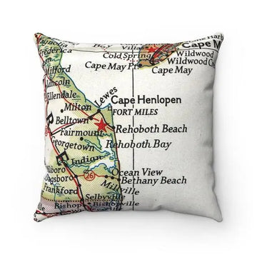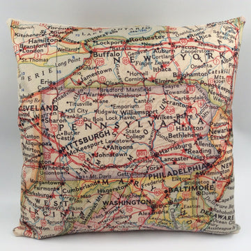 This 18"x18" linen/cotton/poly throw pillow features a vintage map on one side. The back side...