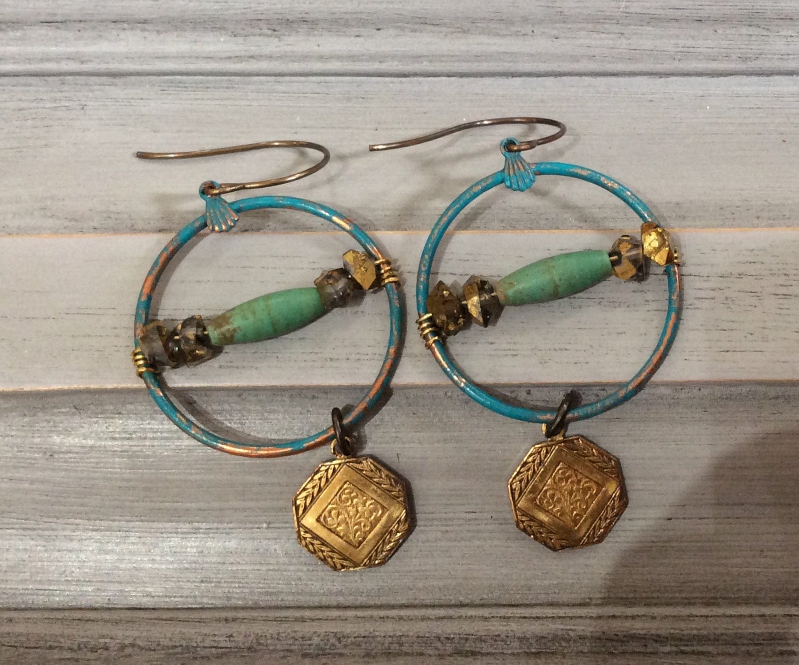 Green Hoop with Mixed Stone and Engraved Gold Disc on Natural Brass Wire