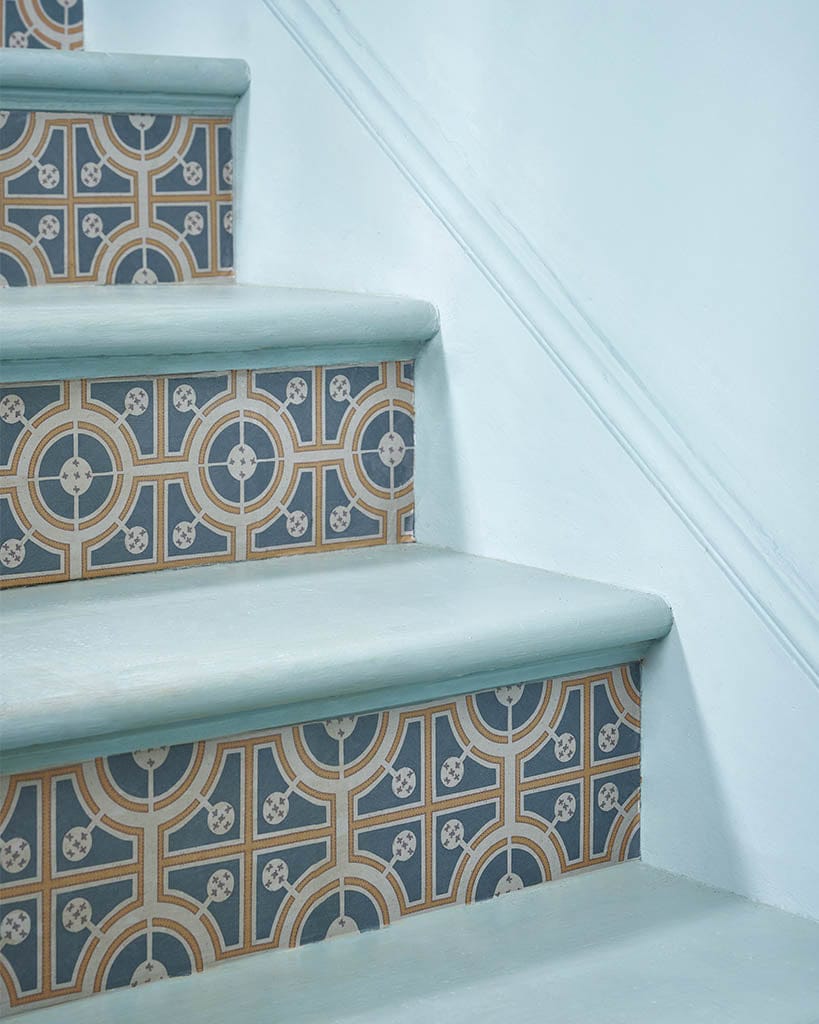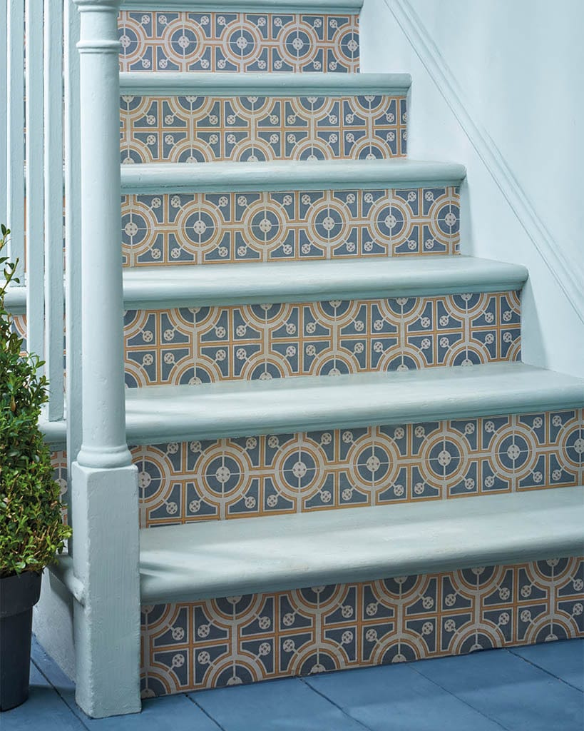 Roundabouts is adapted from an engraved illustration of a design for a knot garden. This Annie Sloan with the Royal Horticultural Society (RHS) Decoupage Paper uses a garden plan from Stephen Blake: “The Compleat Gardeners Practice”. London: 1664. Printed for Thomas Pierrepoint. This bold circle and square design uses Aubusson Blue (available in Chalk Paint® and Annie Sloan Wall Paint) and Chalk Paint® in Tilton, a colorway reminiscent of Portuguese tiles.